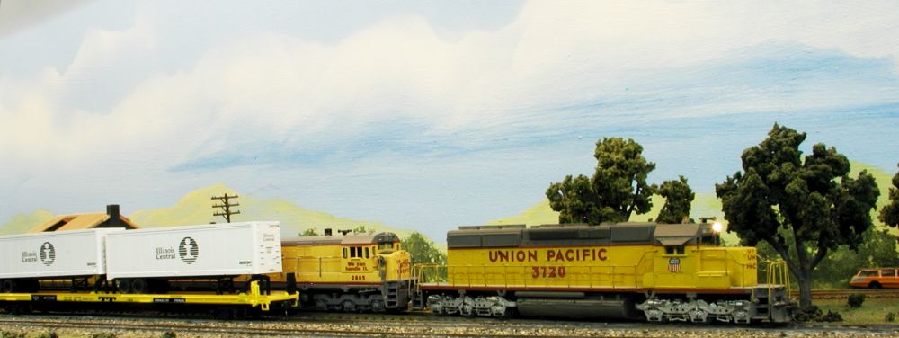 UP Extra 3720, the CLS has just descended Cajon Pass and has pulled into the B Yard where it will pick-up the First May cars. The train will then continue West to Colton, set-out cars to the SP, then continue West to set-out the May cars at Casa Blanca. On the left, we see that Track Inspector Otto Gage’s Hi Rail pickup is parked by the B Yard office.