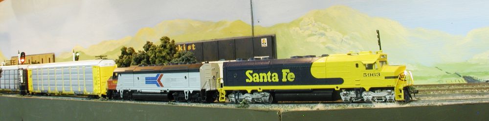 The Auto train, Extra 5963W having switched out cars in San Bernardino and is now continuing West. The train is now nearing the end of it’s journey as it passes through Pachappa and on to Hobart. The second unit is an X Amtrak unit that the Santa Fe acquired in a swap with Amtrak for CF-7. The train originated in Corwith Yard and will terminate in Hobart Yard.