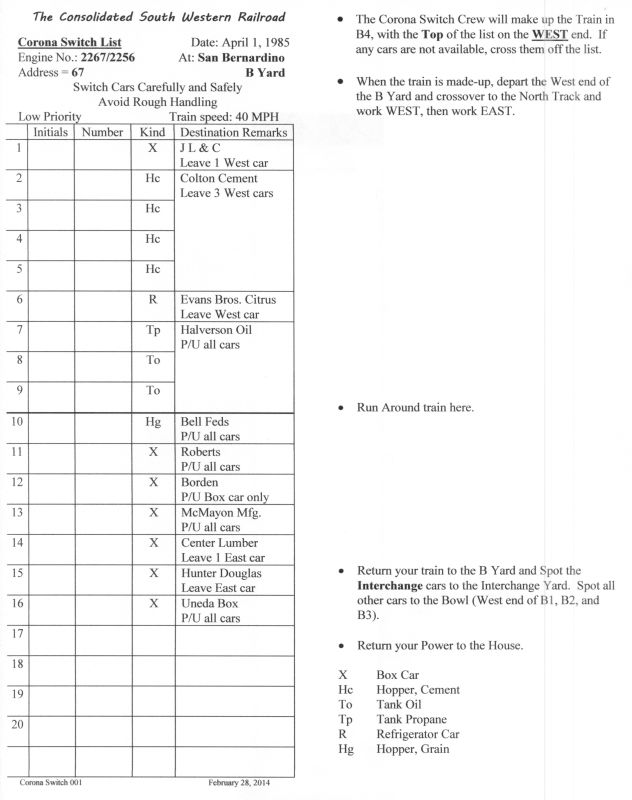 Often times when I have friends over, and it is not an Operation Session, they want to just Operate a train to do some switching. For these times, I have created what we call a Corona Turn. This is like the weekend job that services some industries which require time sensitive service. Unlike the regular operation, the crew has to make up their train in the B Yard, service the industries, then break the train back down when it returns to the B Yard. For the operation of this train, I strongly suggest that they substitute their power, however the home power is available if needed. Below is a sample, one of five of the Corona Switch List.