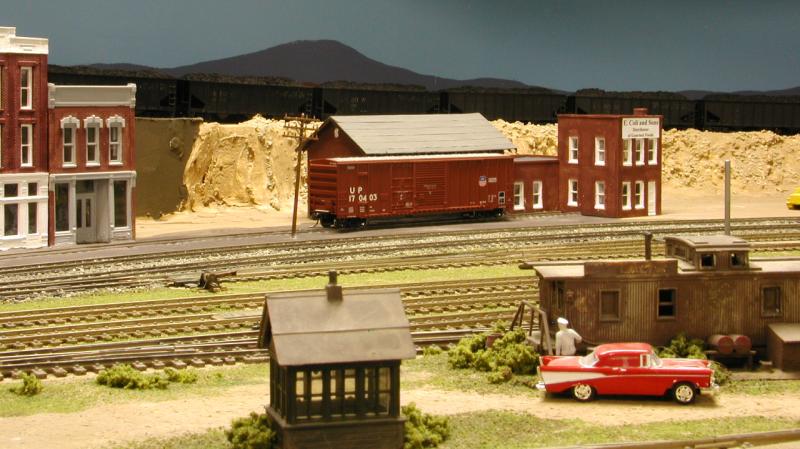 In the distance we see the Edward Coli and Sons Gourmet Foods distribution plant. Edward is our caterer for today’s trip. On the right we see the CSWRR’s car clerk, Igor the Great entering the B Yard Office with a couple of pizzas. The red 57 Chevy is Igor’s pride and joy.