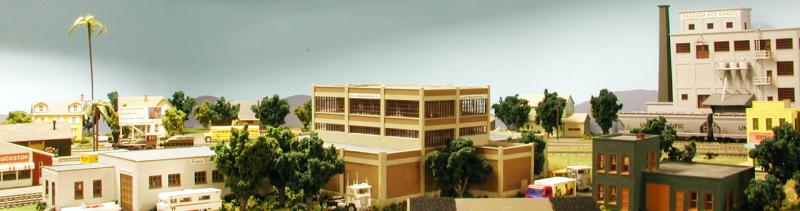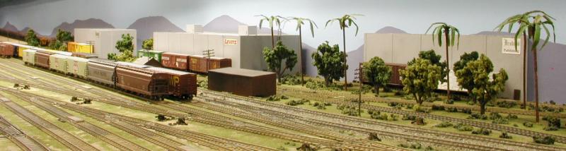 As we pass through the San Bernardino B Yard, we observe several warehouse distribution plants. In the far distance is the Sears Warehouse, in the middle is the Levitz Warehouse and on to the right is the Brovald Publishing Company.